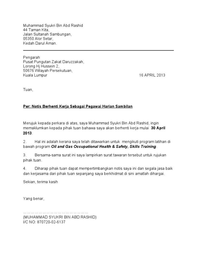 Notis Berhenti Kerja Sebulan / Surat Berhenti Kerja Contoh Surat Rasmi Berita Semasa : Sy berkerja sbagai mekanik,kat ladang.tp mslh nya,majikan saya suruh saya jadi mandor,driver lori,mekanik.tp cuma gaji kerja.gaji tetap sama jak.bila saya minta notis x d terima.potong epf,socso pun xda.sy saya dah berkerja dgn majikan saya selama 10,.dgn gaji rm2300 sbln….saya nak tanya.klau sy berhenti,dgn notis 24 jam.saya dapat.